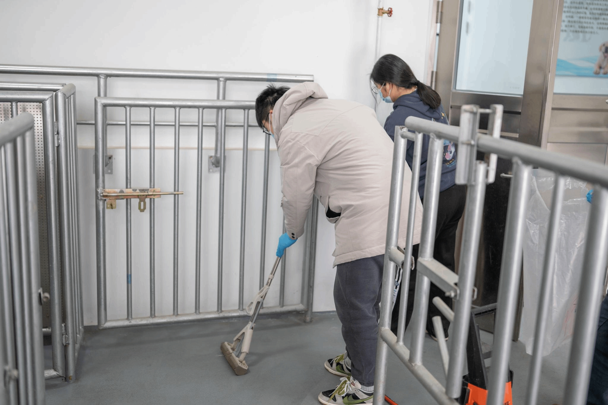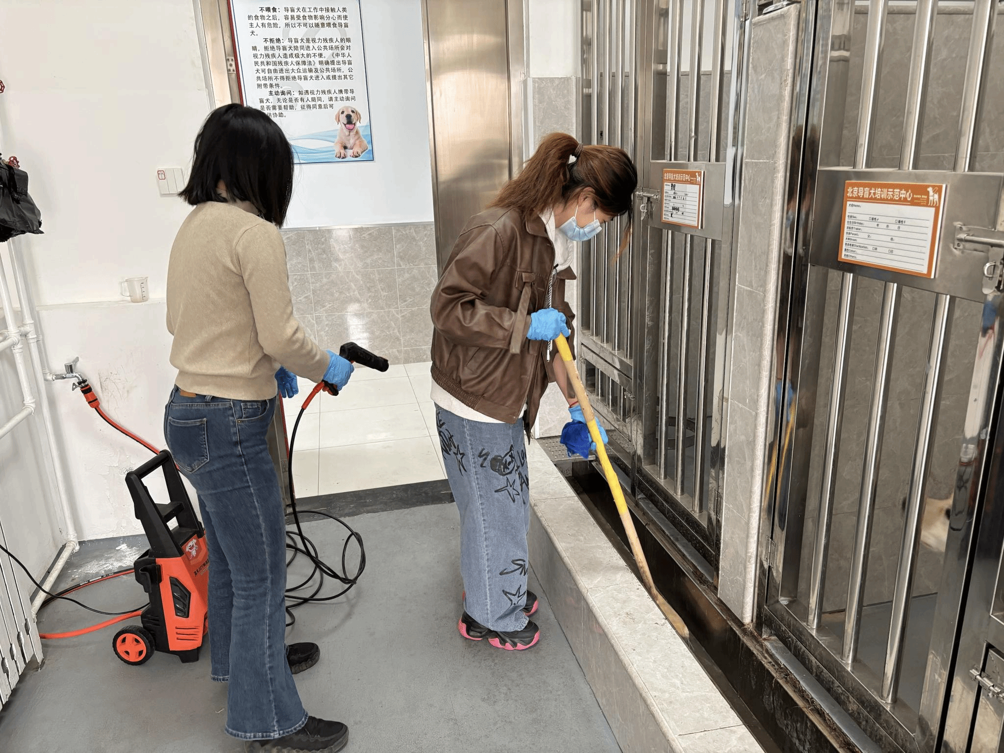 在示范中心,两校学生共同参与到犬舍清洁志愿活动中。学生们分工协作,在工作人员的指导下完成清扫犬舍、消毒器具、整理训练器材等工作。