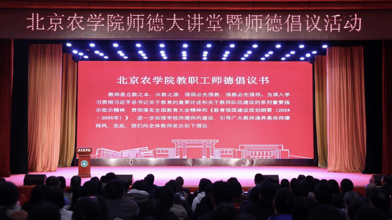 会上发布了《北京农学院教职工师德倡议书》,号召全体北农教职工坚定政治方向,自觉爱国守法;坚持言行雅正,涵养高尚师德;潜心教书育人,关心爱护学生;严守学术规范,培育优良教风;传播优秀文化,积极奉献社会。自觉弘扬教育家精神,涵养师者匠心,践行崇高师德,做学生锤炼品格的引路人、做学生学习知识的引路人、做学生创新思维的引路人,做学生奉献祖国的引路人,在教育强国建设中彰显北农教师的使命与担当。