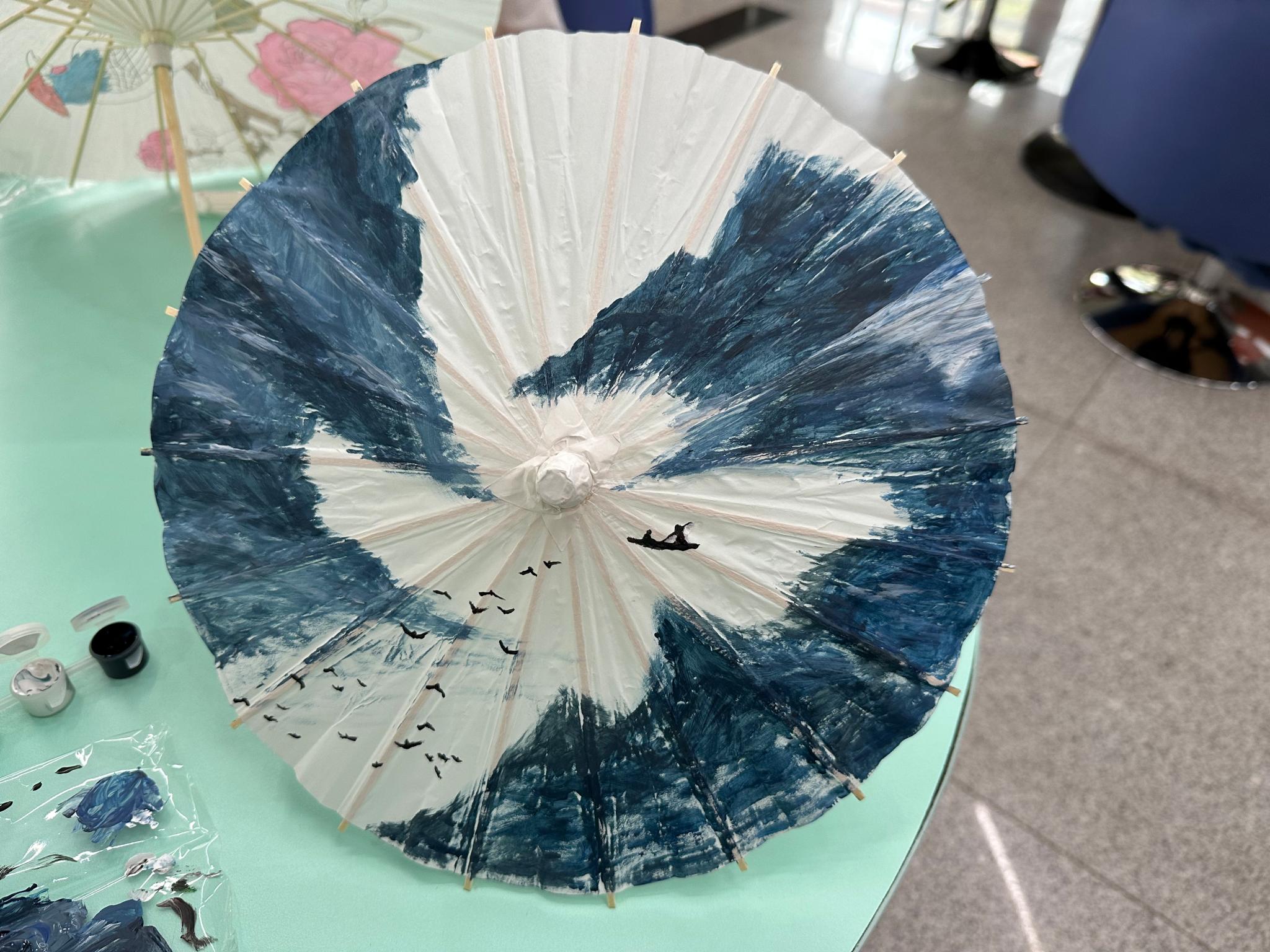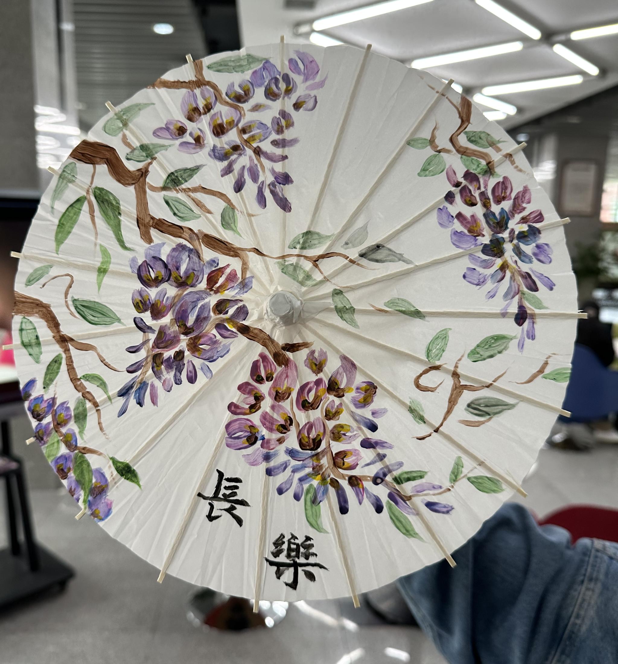 活动结束后,师生们将制作完成的油纸伞作品展示在活动场地中央并拍照留念,部分同学还分享了自己作品的设计理念、创作思路以及制作过程中的收获与体会。