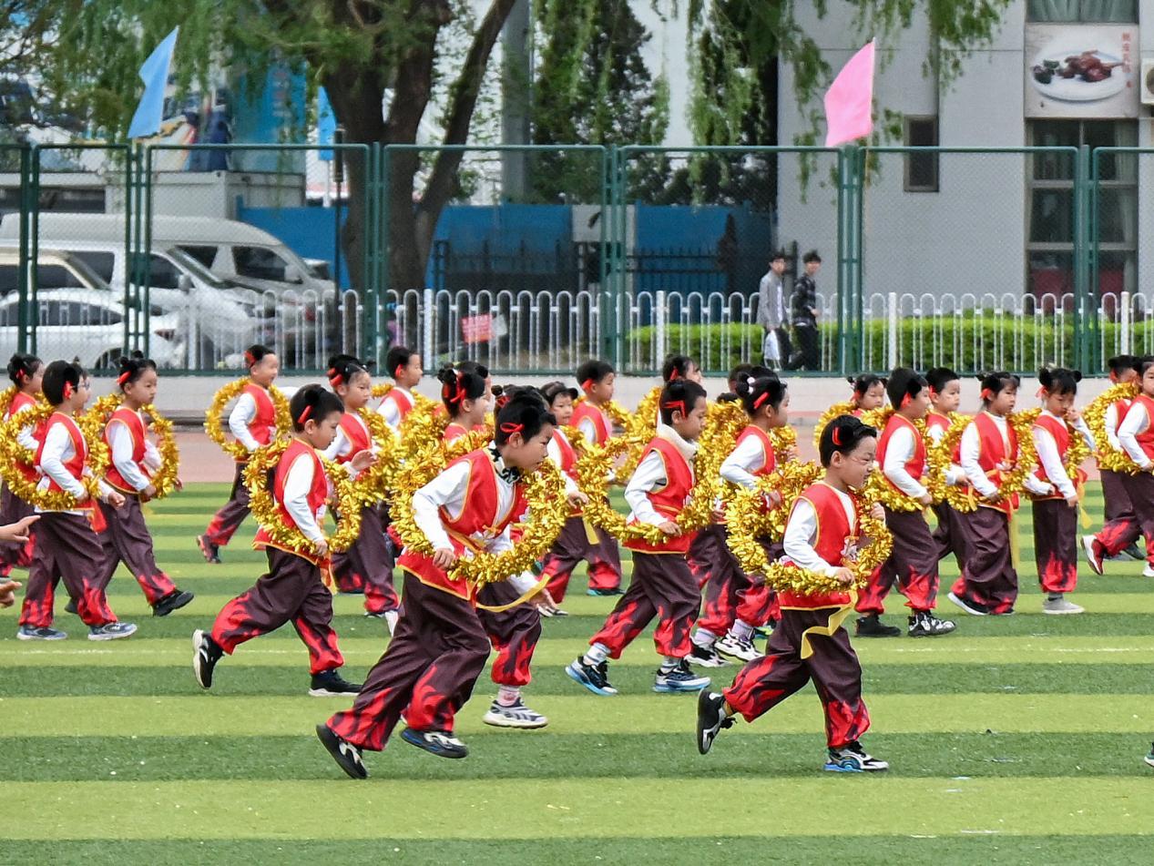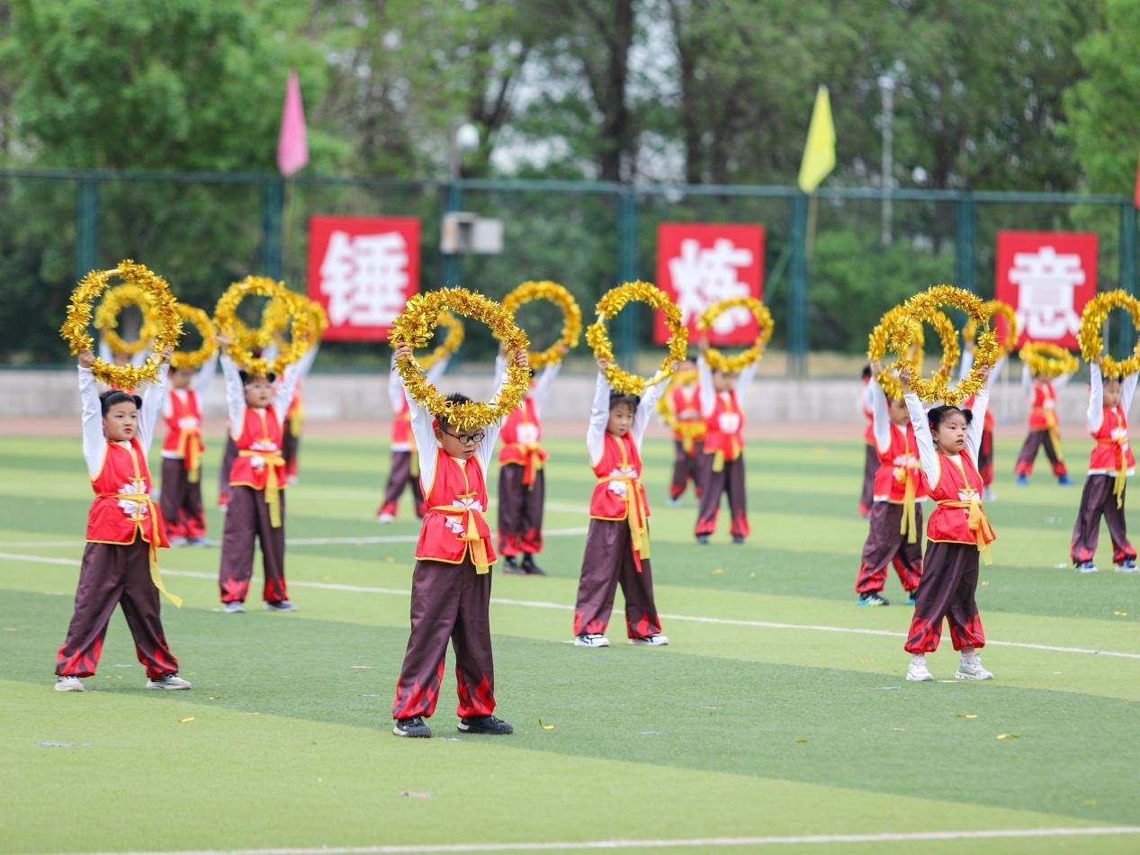 北农幼儿园百名萌娃化身“小哪吒”,身着红衫,手持乾坤圈,稚嫩脸庞写满自信与蓬勃,以充满创意的“国潮体育秀”点燃全场。