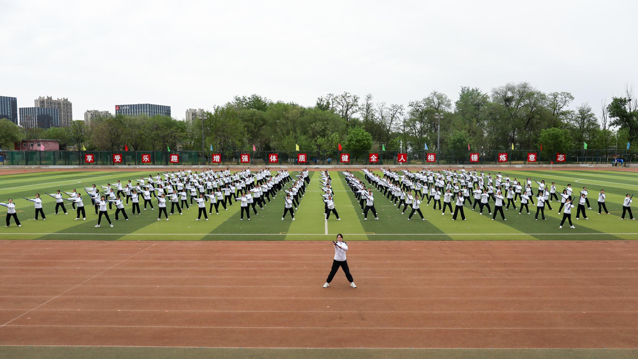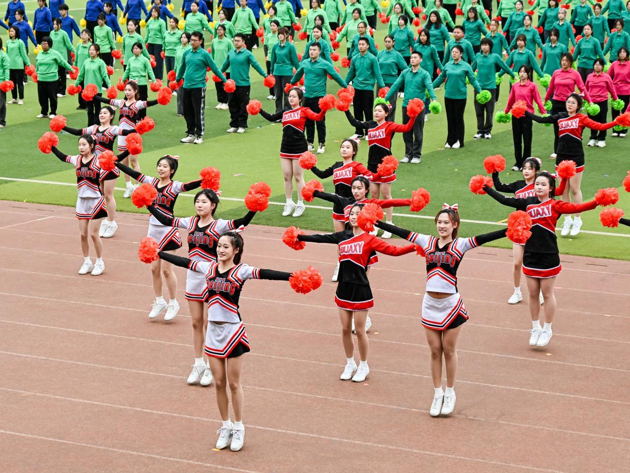 教工代表队带来养生太极杖表演,240名教职工动作如行云流水,以“动中寓静,形神合一”的一招一式诠释了中华传统体育的魅力。