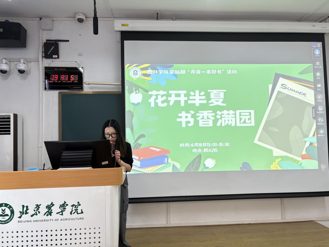2025年6月18日,园林学院第86期“月读一本好书”活动在教A 215顺利举行,本期的主题是“花开半夏,书香满园”。夏日炽热,柳丝轻舞,六月的阳光正以最热烈的笔触,在树荫间勾勒着翠绿的篇章。我们相聚在这盛夏炎炎的时光里,愿每位书友都能寻得内心的清凉之地。活动由园林学院研究生会学术部王娅力主持,园林学院2024级研究生积极参与,大家共品书韵,在炎炎夏日中一同收获知识与乐趣,为本学年最后一次读书分享会画上圆满的句号。