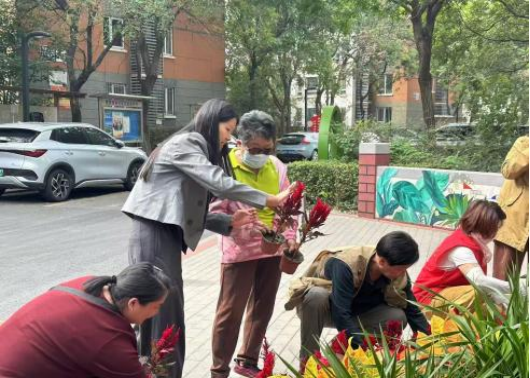 午后,活动转场至领秀慧谷A区。在师生的统筹规划下,居民们分工协作,搬运、摆花、整理一气呵成。暖阳下,红、橙、绿三色植物错落有致,与“欢度国庆”主题元素相映成趣,吸引不少路过居民驻足参与。“能亲手装点社区特别自豪,这才是实实在在的节日氛围。”一位老年居民的话道出了大家的心声。